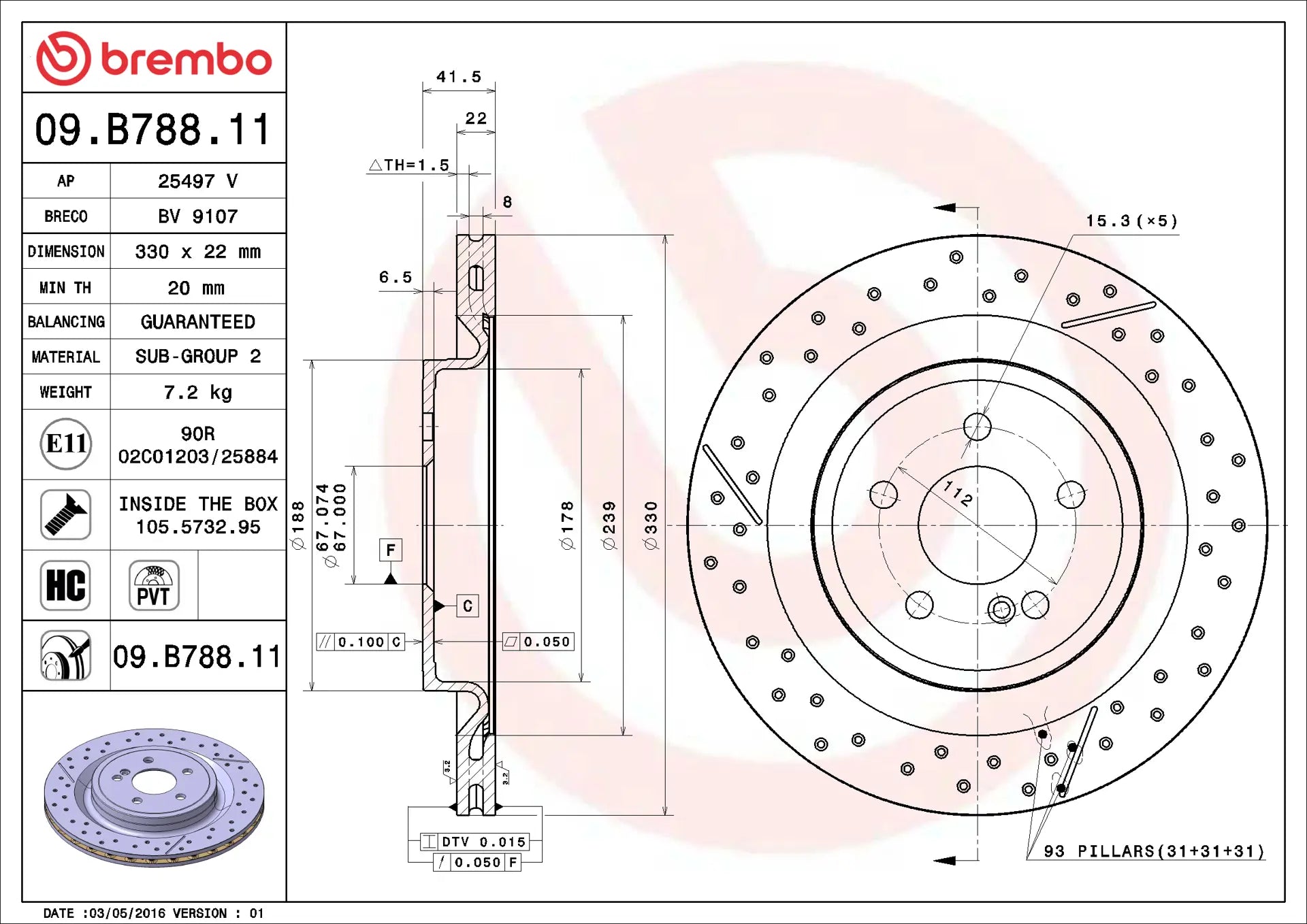 จานเบรก Brembo 09.B788.11 ผลิตจากเหล็ก High Carbon (HC) พร้อม เจาะรู (Drilled) เพื่อเพิ่มการระบายความร้อน ลดความร้อนสะสม และช่วยให้ผ้าเบรกทำงานได้เต็มประสิทธิภาพ เหมาะสำหรับรถสมรรถนะสูงในตระกูล AMG 45 Series